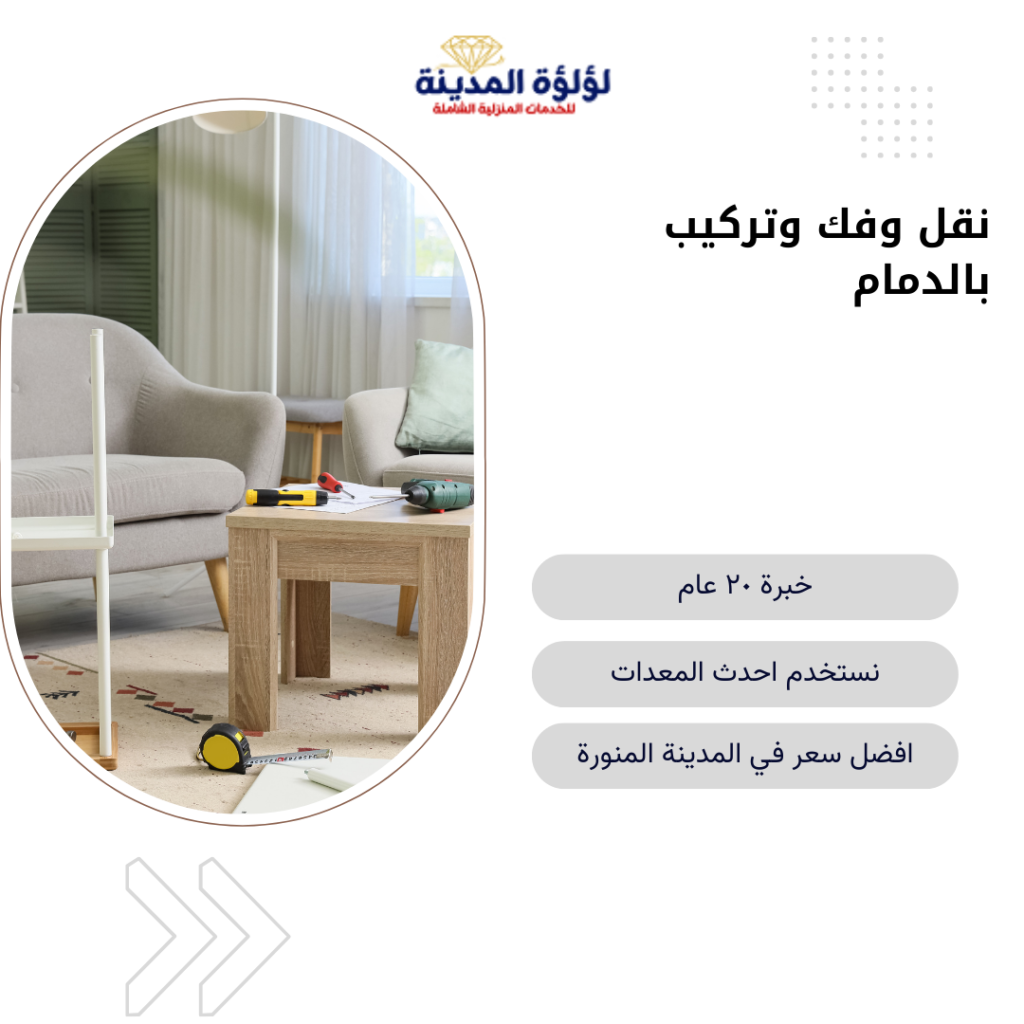 نقدم خدمة نقل وفك وتركيب الأثاث بالدمام باحترافية عالية تضمن الحفاظ الكامل على الأثاث دون أي خدوش أو تلف، مع تنفيذ منظم يبدأ بالفك الدقيق وينتهي بالتركيب المتقن في الموقع الجديد.